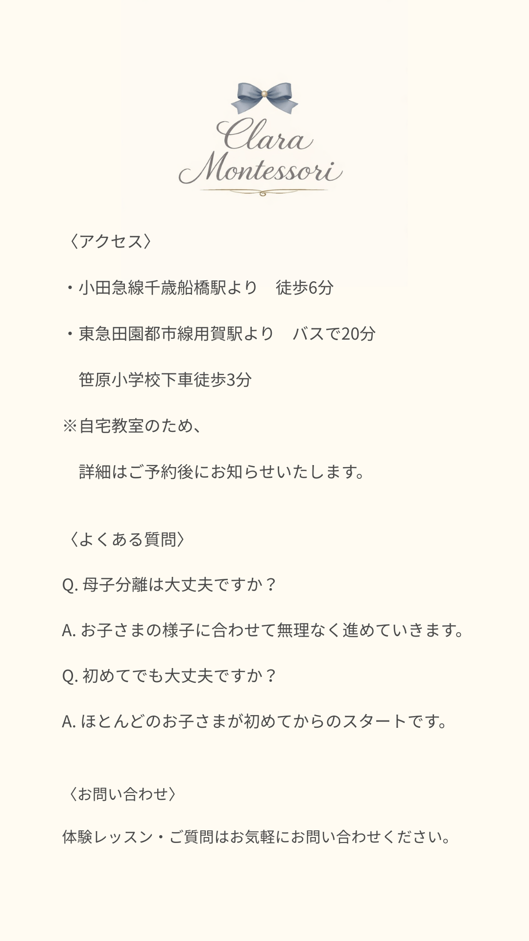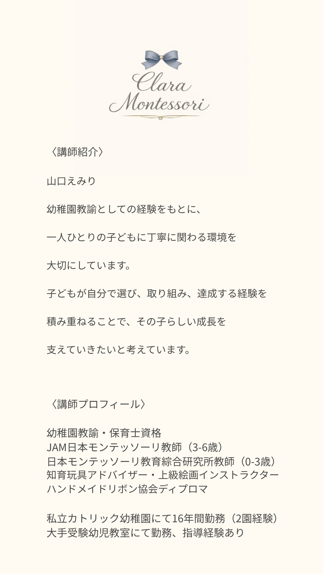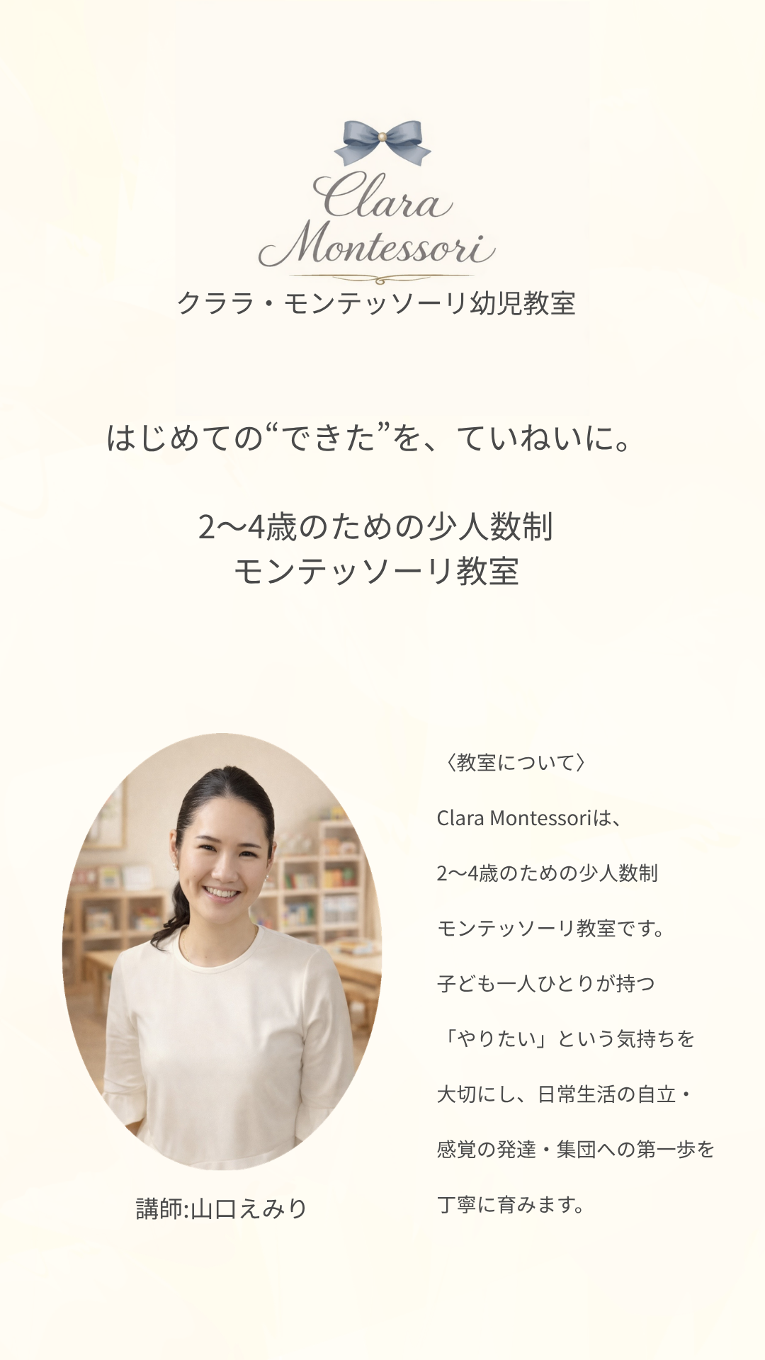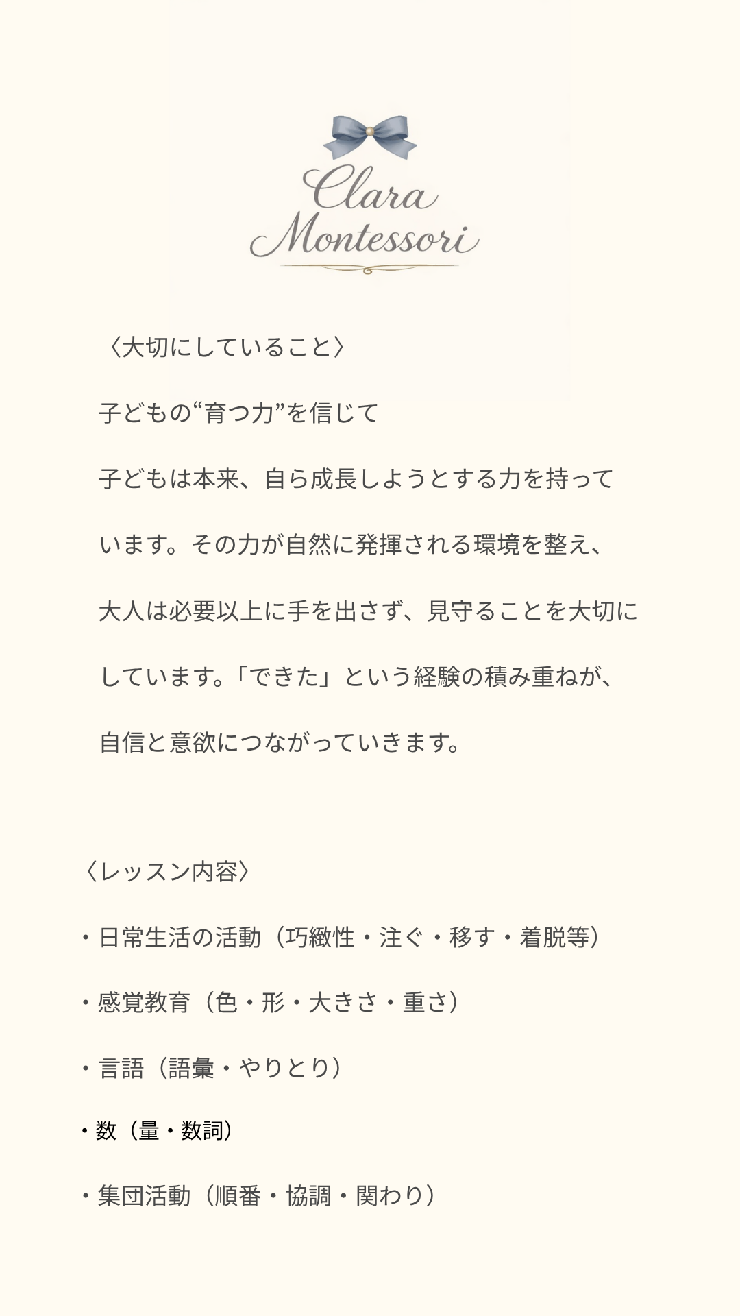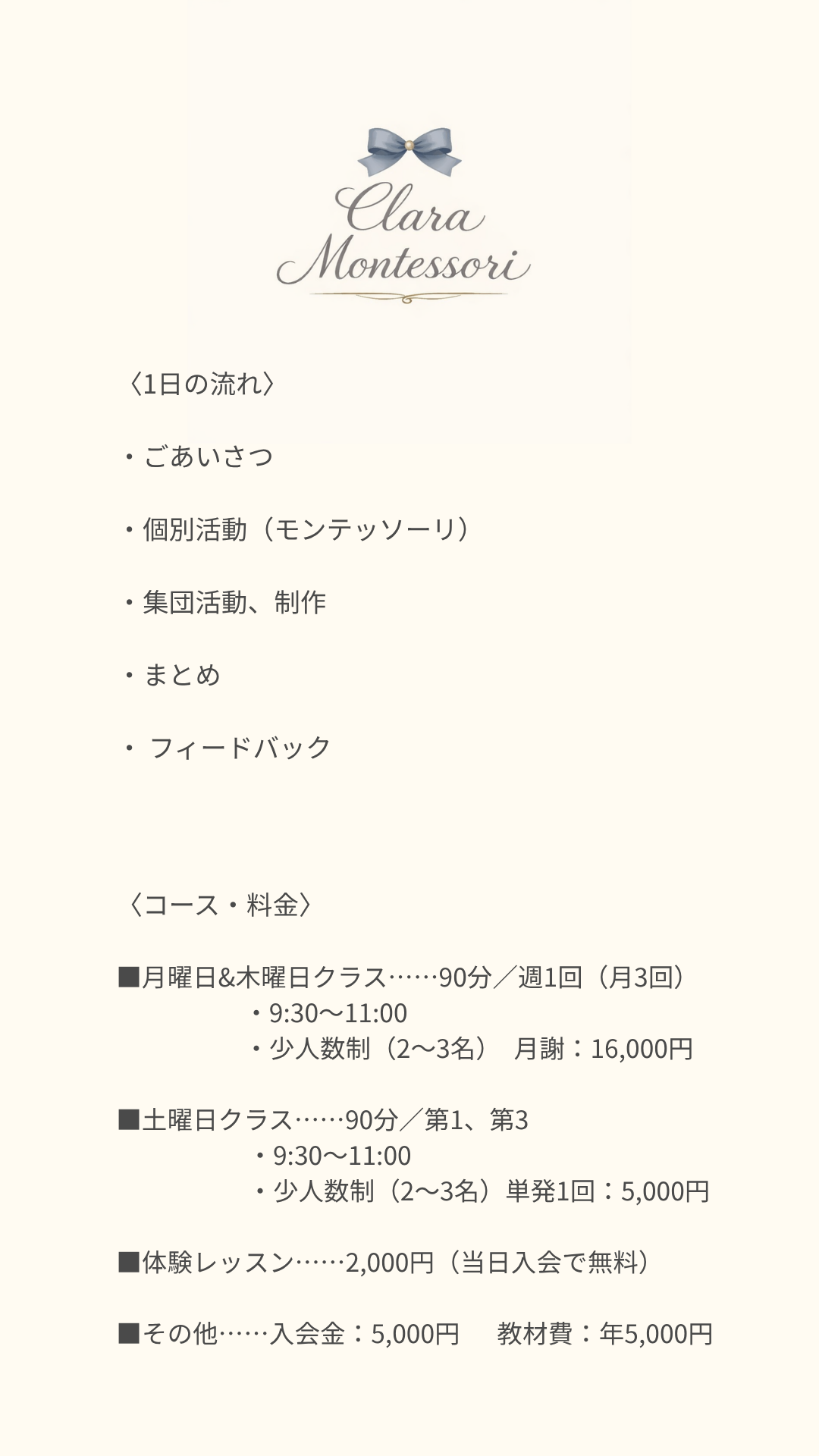 「クララ・モンテッソーリ(Clara Montessori)幼児教室」について お教室のお知らせ X Facebook はてブ LINE コピー 2026.04.24 ↓↓↓ 公式LINEはこちら ↓↓↓ ↓↓↓ 公式Instagramはこちら ↓↓↓